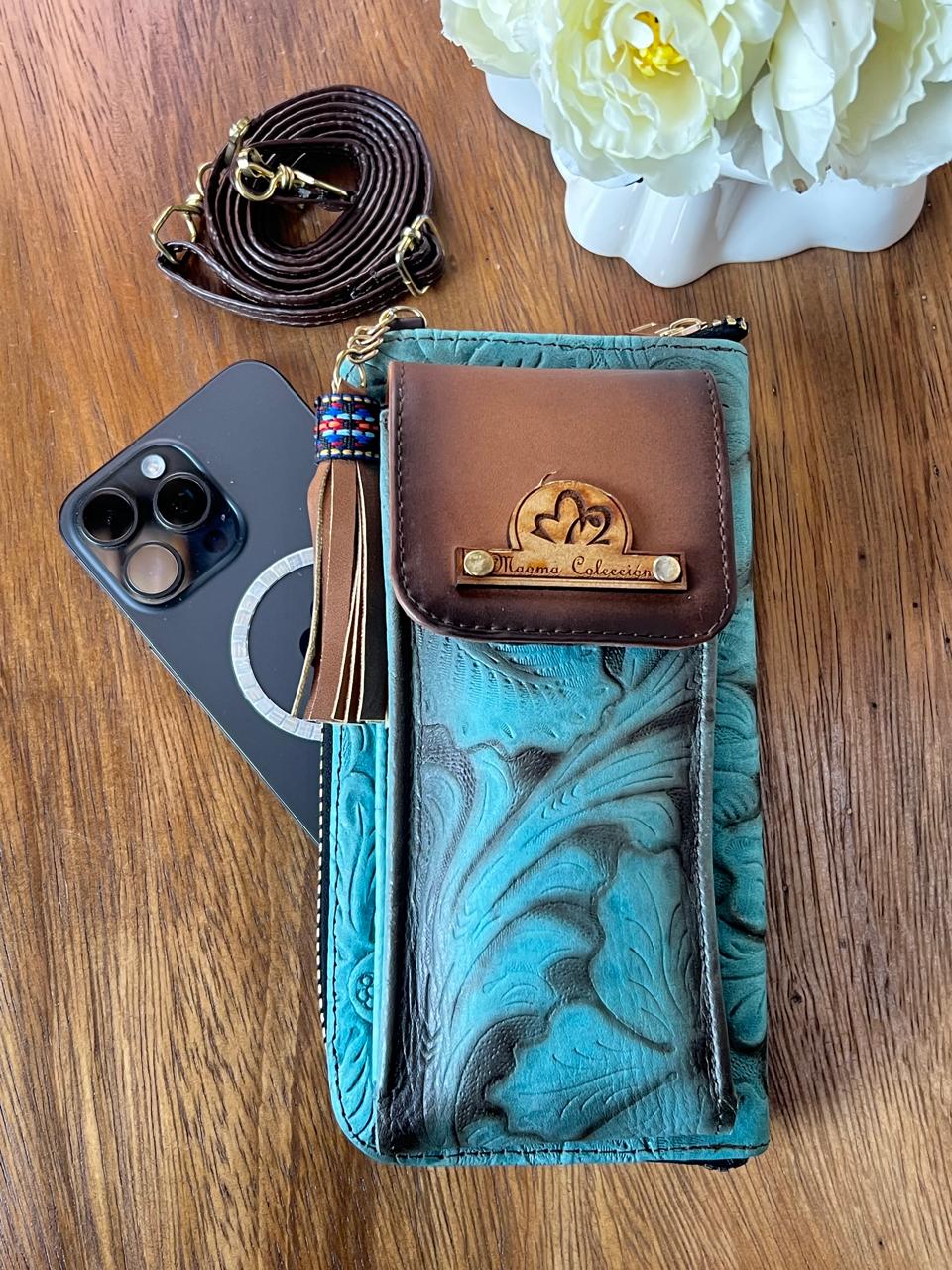 MAOMA PORTACELULAR FLORES TURQUESA DELINEADO